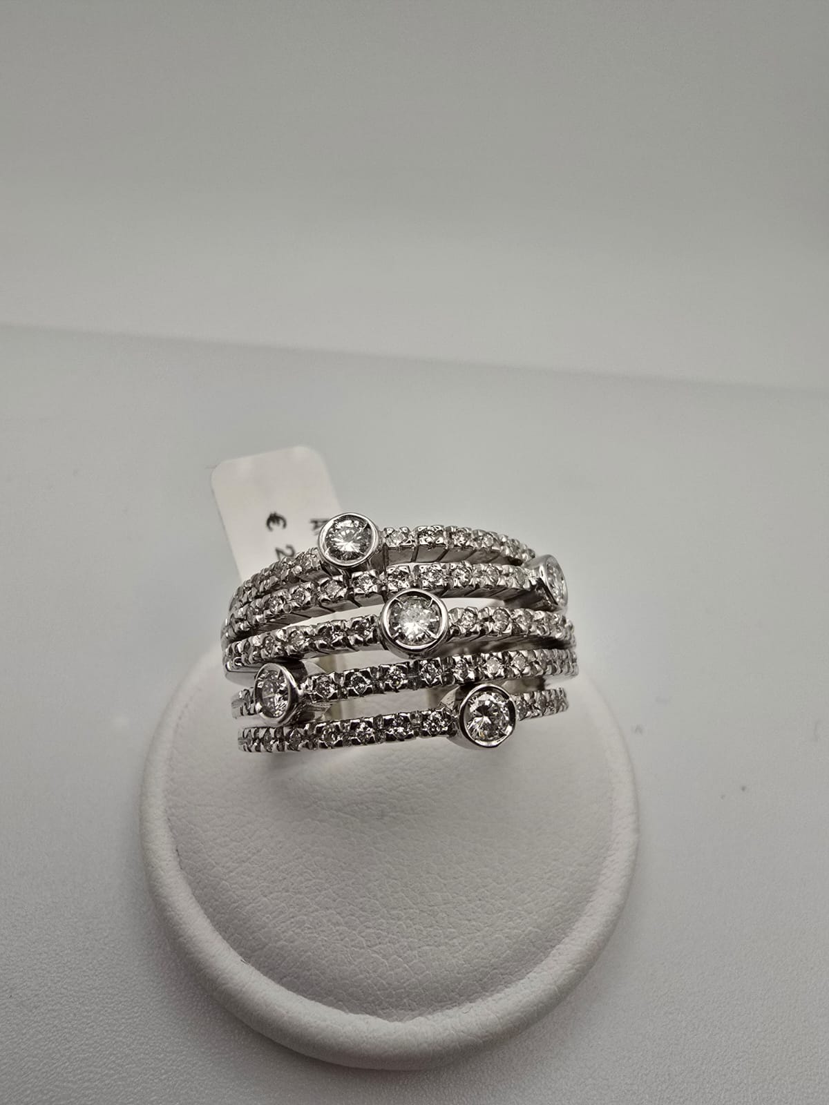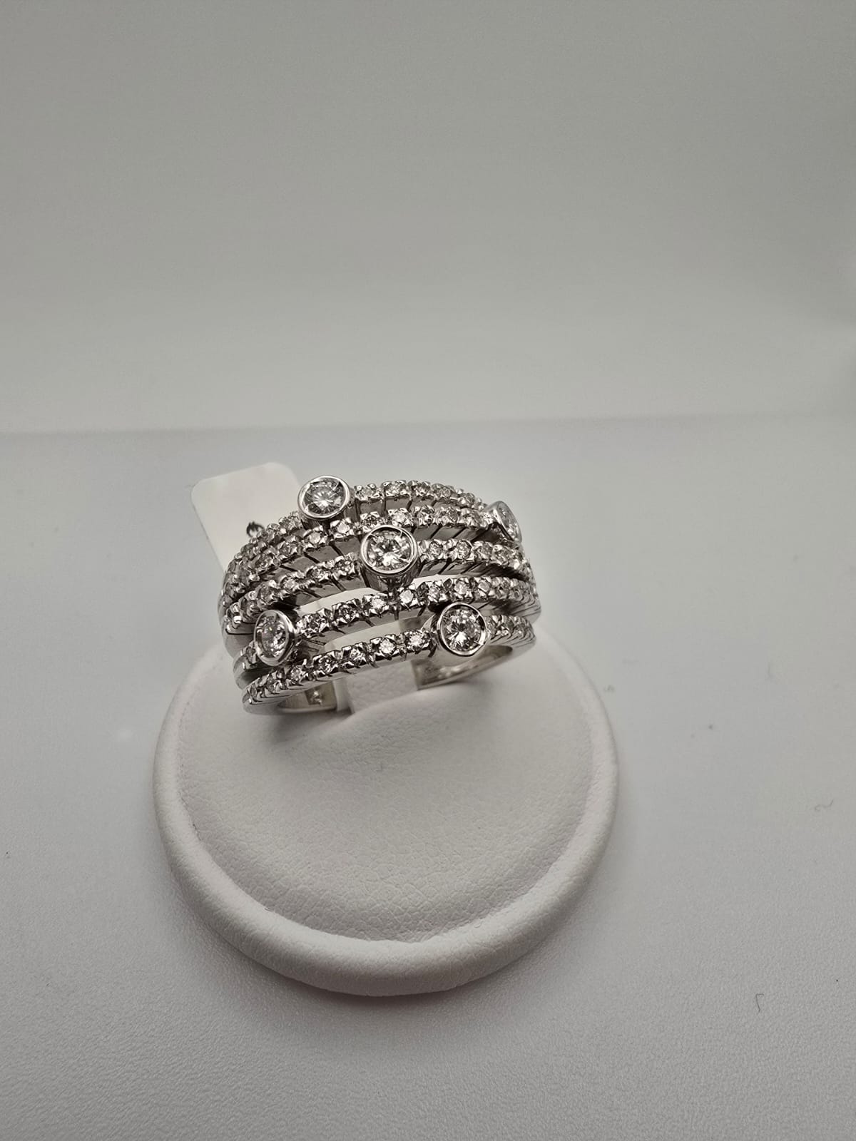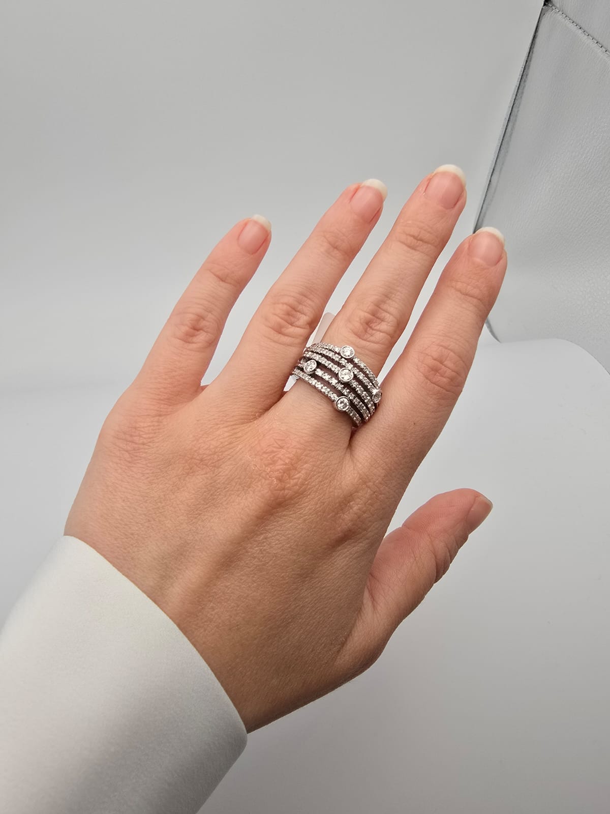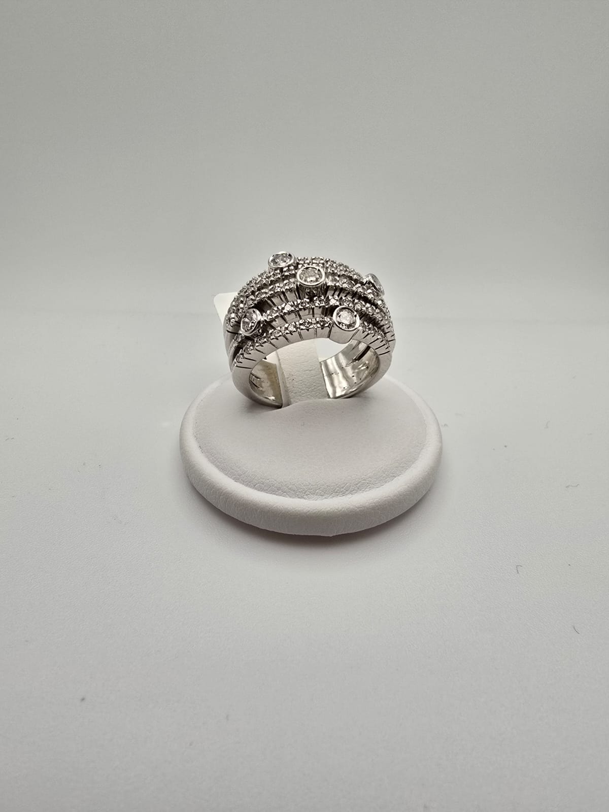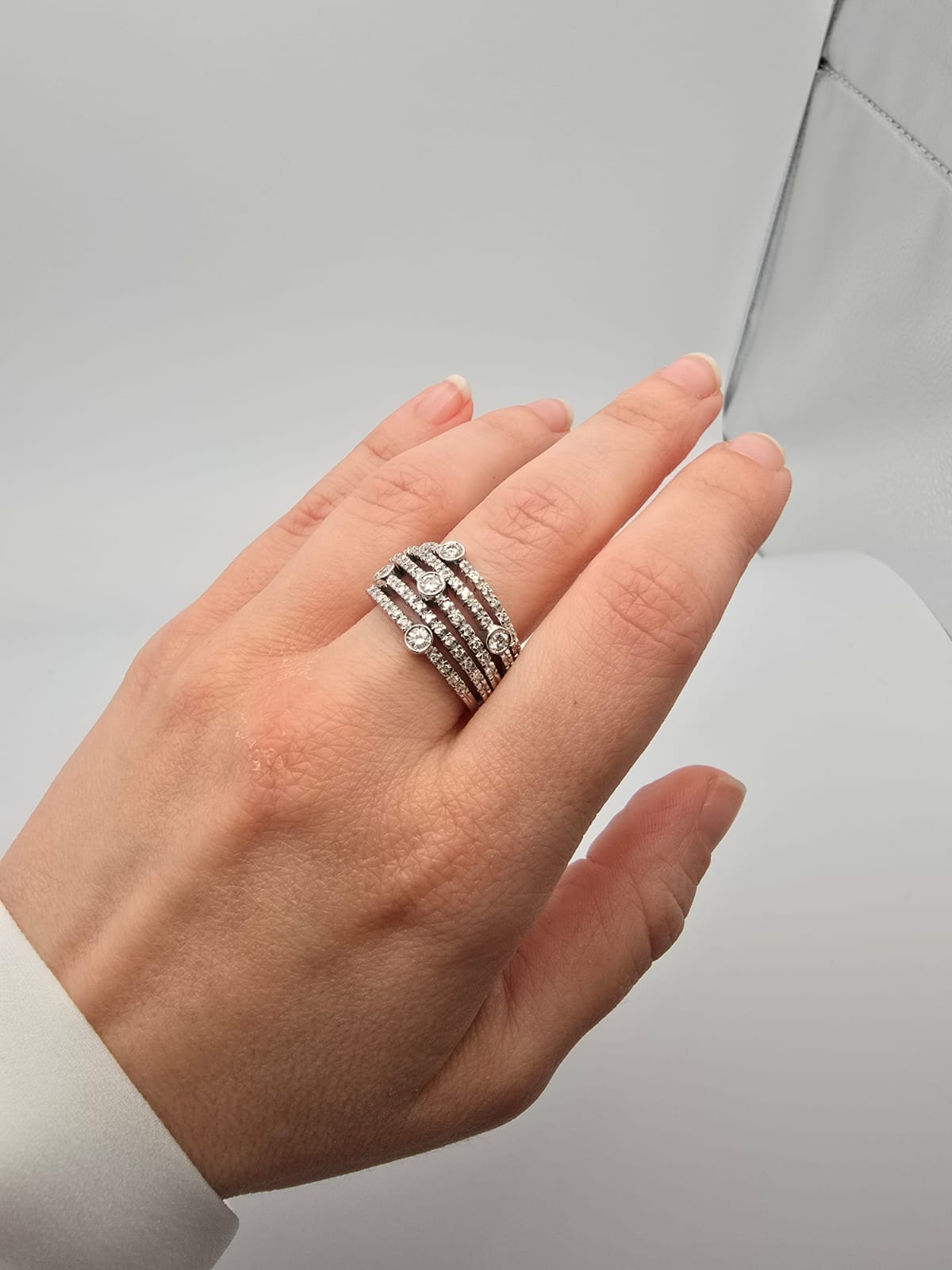 Anello elegante e moderno, composto da più fasce in Oro Bianco 18 Kt tempestate di Diamanti. Un gioiello dal grande impatto visivo, perfetto per chi ama l’equilibrio tra raffinatezza e originalità. Ideale per le occasioni più importanti ma adatto anche ad impreziosire il proprio stile quotidiano