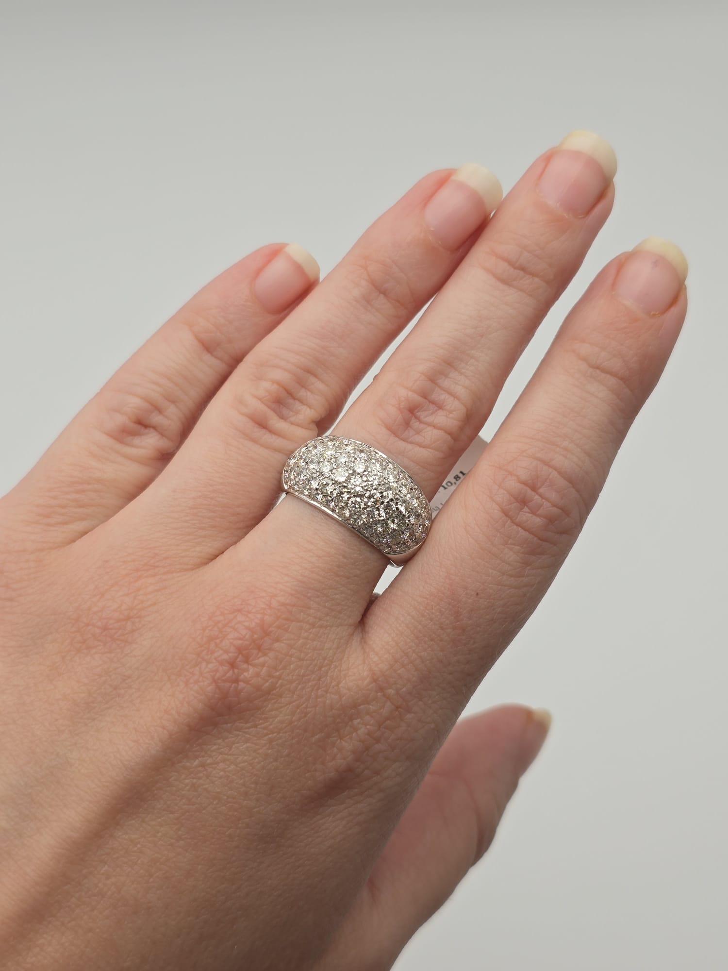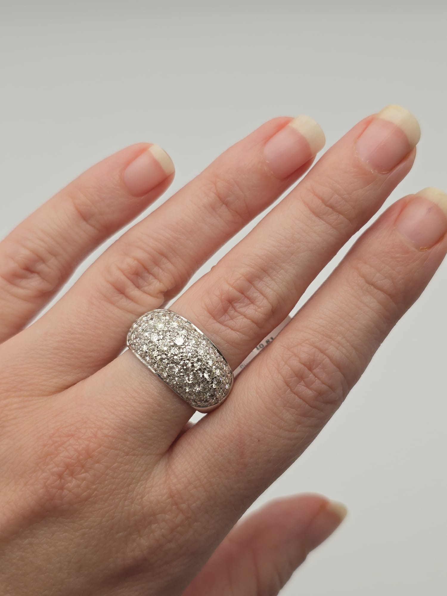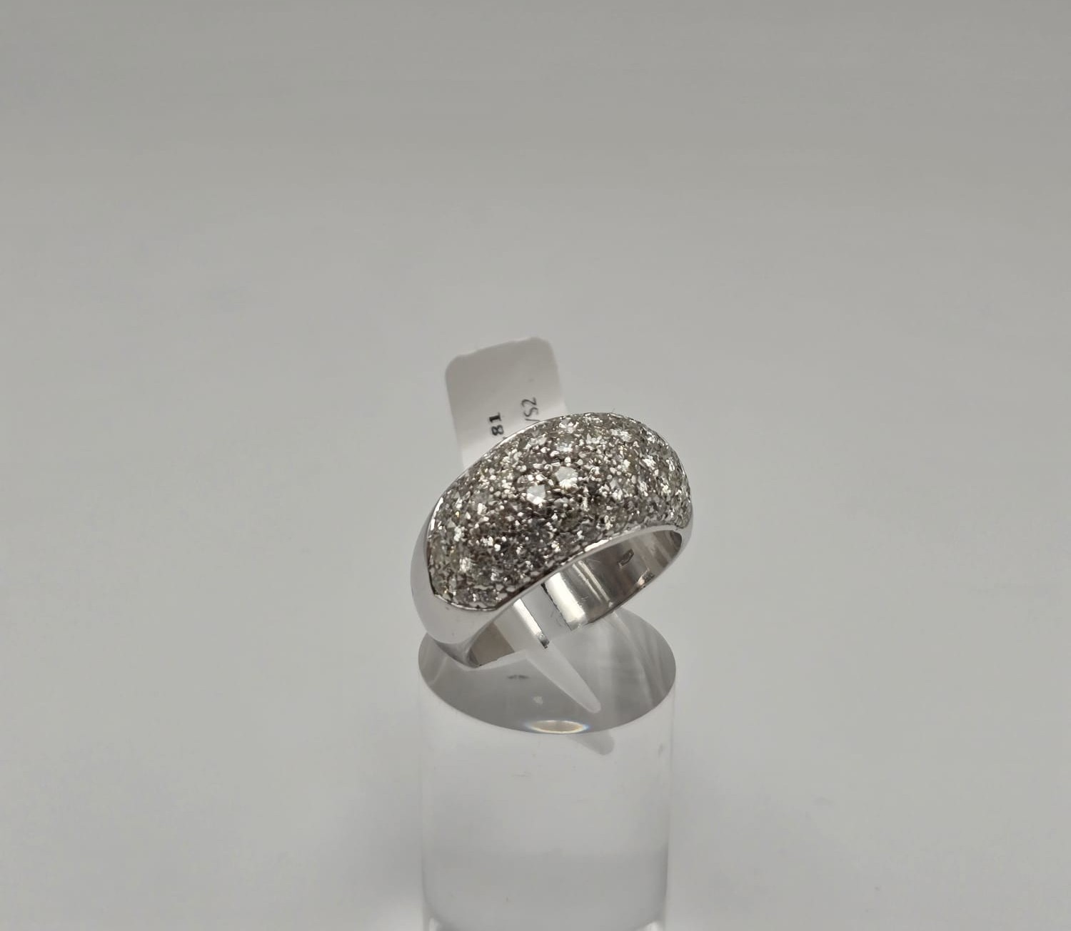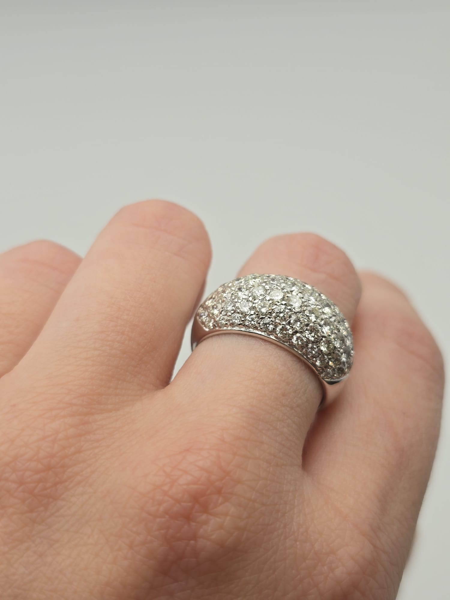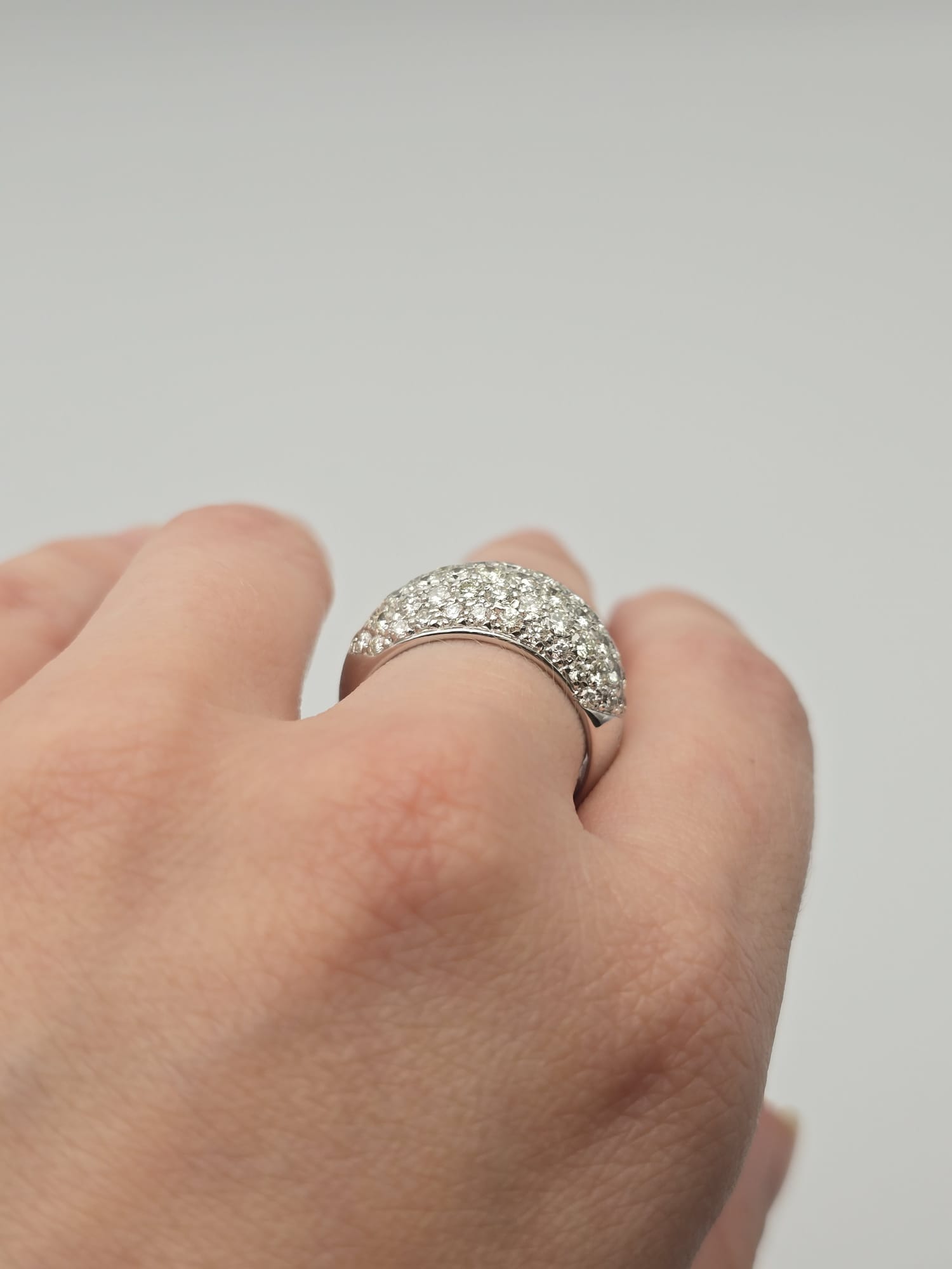 Anello importante, elegante e moderno, composto da più fasce in Oro Bianco 18 Kt tempestate di Diamanti. Un gioiello dal grande impatto visivo, perfetto per chi ama l’equilibrio tra raffinatezza e originalità.