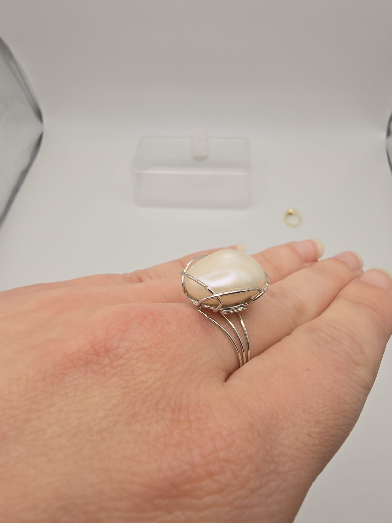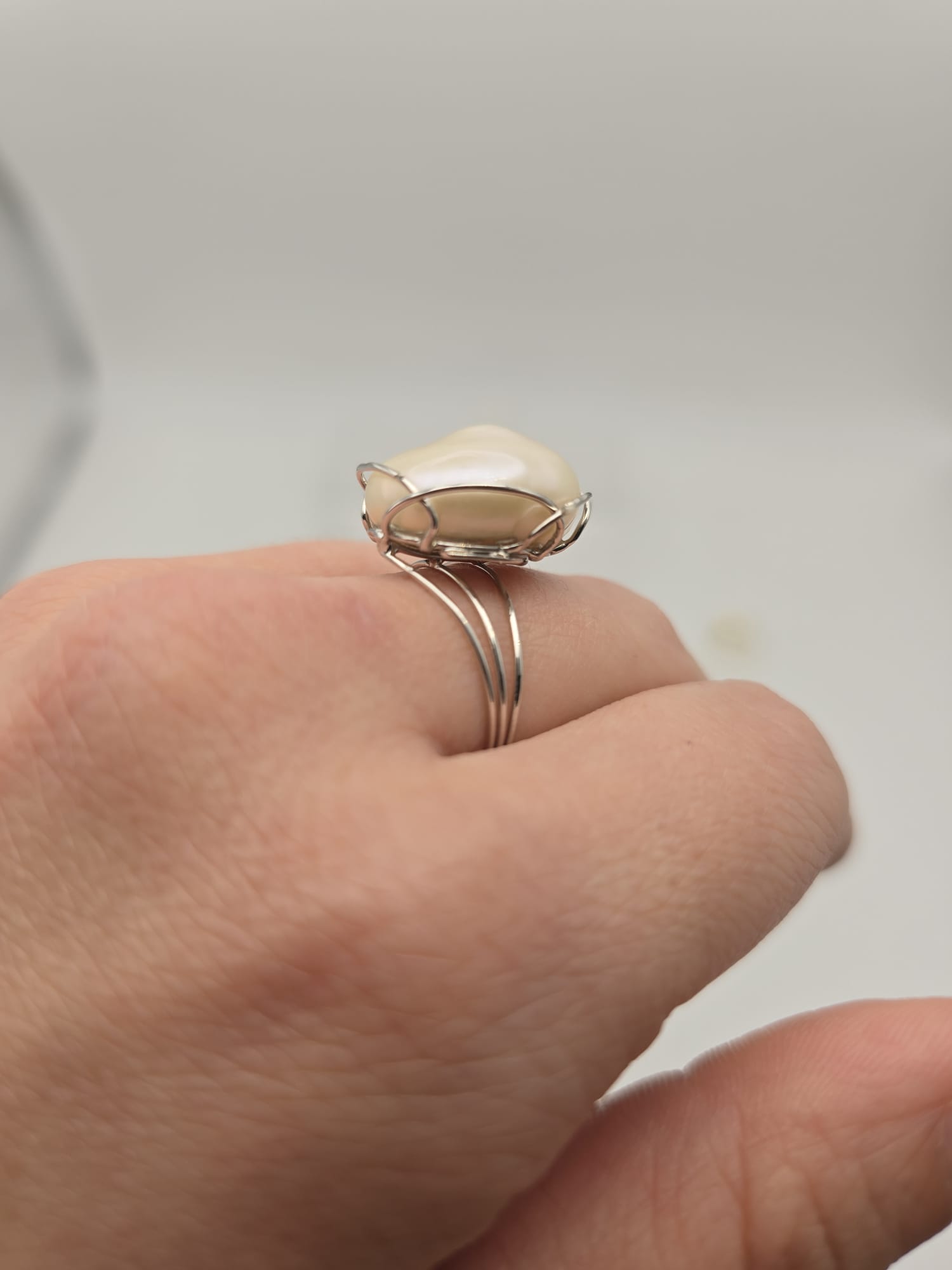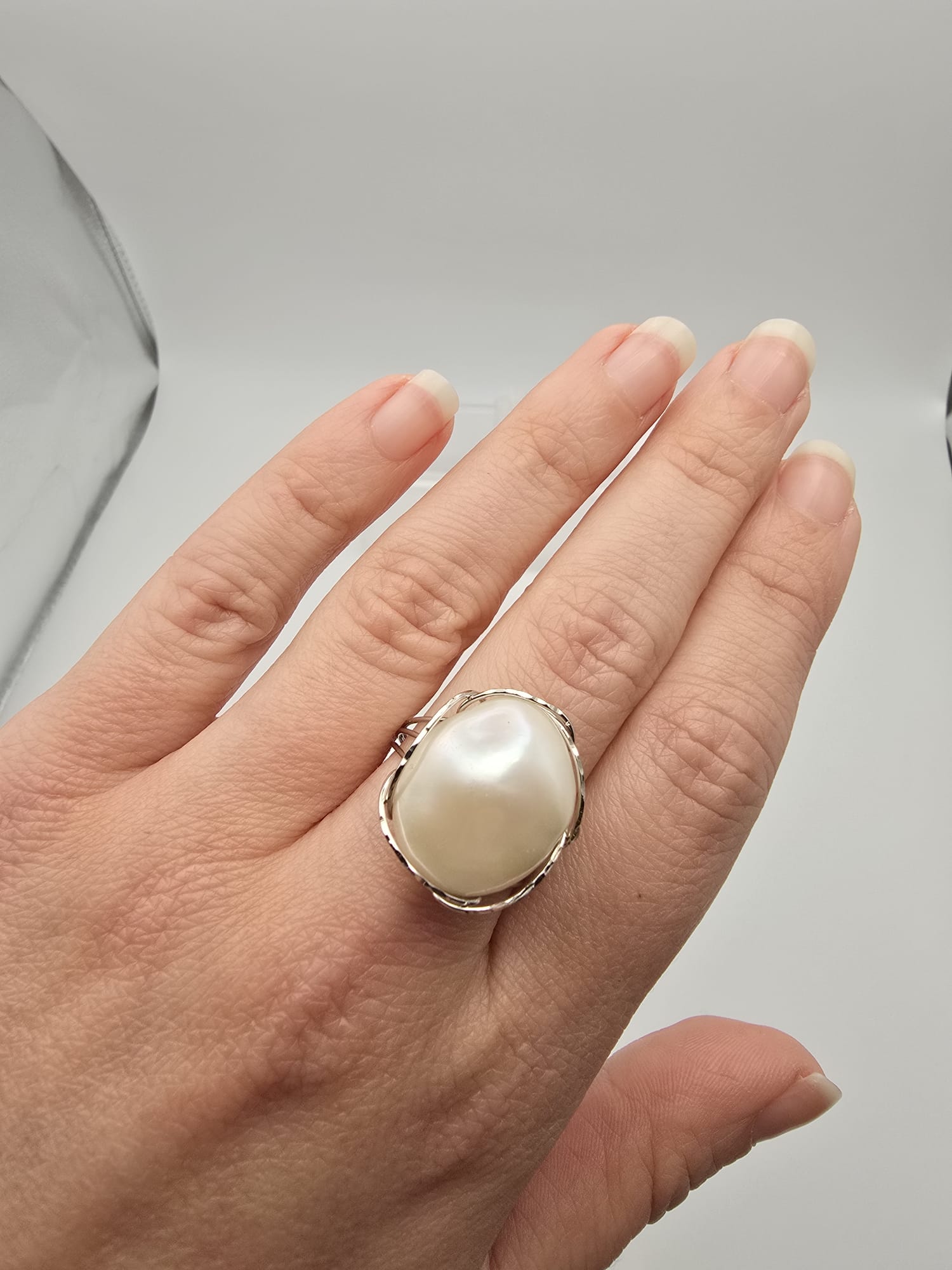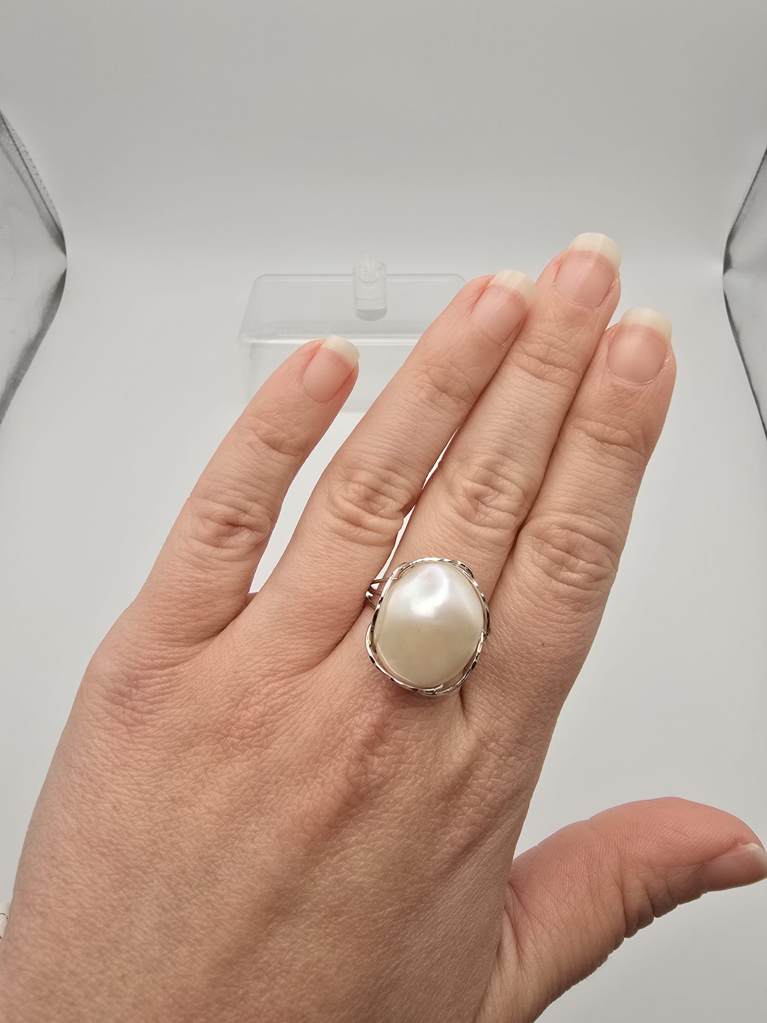 Importante anello di Oro Bianco 18 Kt con stupenda perla naturale Barocca.